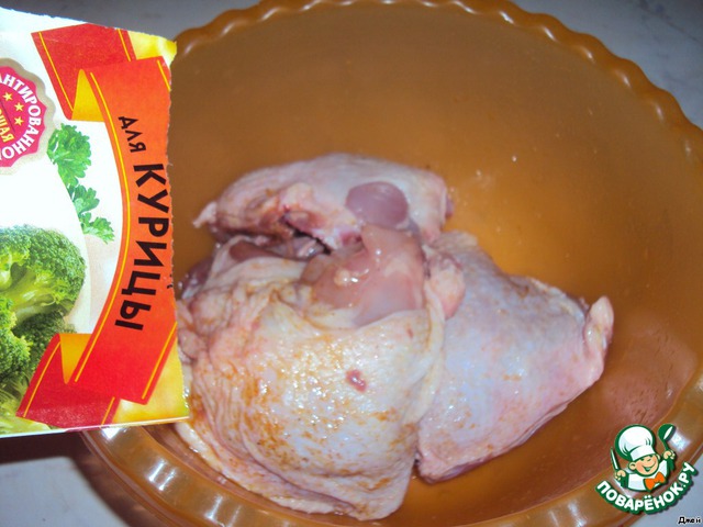 Окорочка моем, режем на порционные кусочки, посыпаем приправой "Для курицы" и солью(хватит и щепотки)