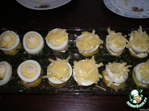 Картошку нарезать кружочками толщиной 5 мм. Яйца порезать тоже кружочками. Яблоко натереть на крупную терку. Филе селедки порезать кубиками