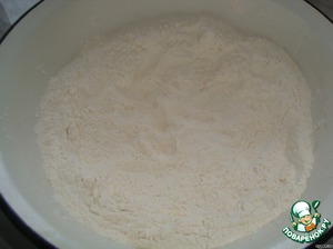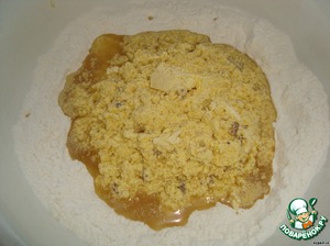 Полученную массу выливаем в углубление муки. Замешиваем быстро тесто.