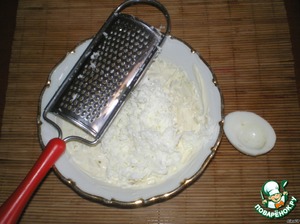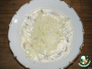 Далее натираем желток, покрываем майонезом и сверху покрываем тертым сыром.