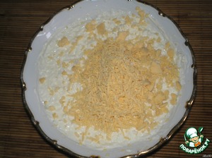 • Далее натираем желток, покрываем майонезом и сверху покрываем тертым сыром.