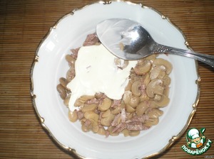 Выложить маринованный лук на первый слой салата. Покрыть слой небольшим количеством майонеза.