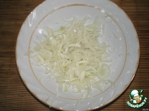 Нарезать полукольцами лук, выложить в отдельную тарелку и сбрызнуть несколькими каплями уксуса. Все перемешать.