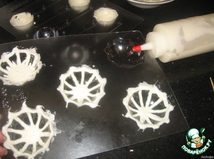 Снежинки делала из белого шоколада. Шоколад измельчить, заполнить им пластиковую бутылочку и поставить в микроволновку на 1 мин. /в зависимости от мощности/. Это очень удобно - остатки шоколада я потом так же храню, подогревая его в следующий раз.