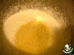 Тесто: взбиваем белки, добавляем сахар, далее по одному желтки и растительное масло, муку с крахмалом просеиваем и размешиваем лопаточкой