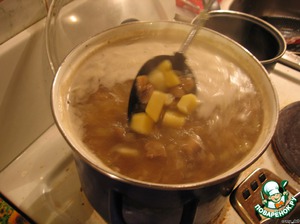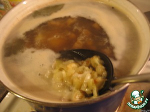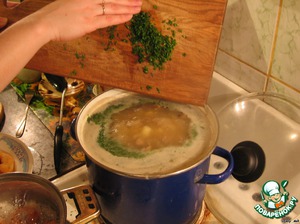 Наша кастрюлька продолжает кипеть. В кипящую воду выливаем из сковородки жареную муку, суп станет густым...