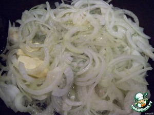 Лук нарезать полукольцами и обжарить на смеси растительного и сливочного масла.