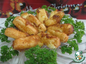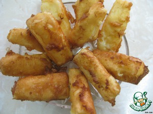 Сыр нарезать брусочками (длиной 5-6 см и толщиной 1 см).