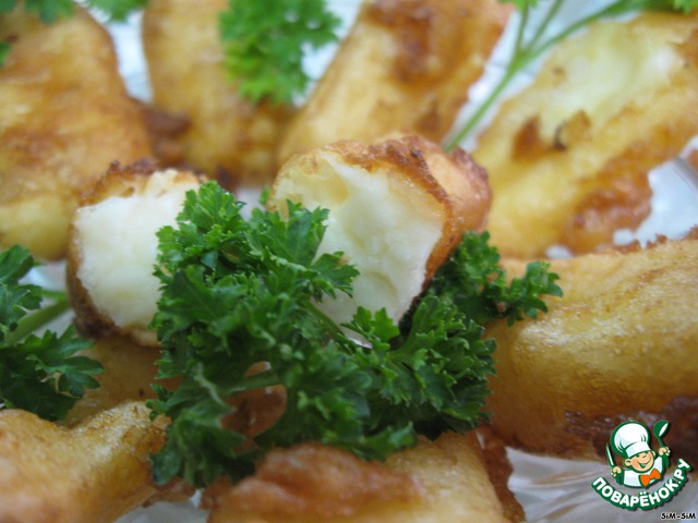 Сыр обвалять в муке, затем вилочкой опускаете в кляр и жарите во фритюре мин. 2, аккуратно переворачивая, чтобы порозовел со всех сторон,