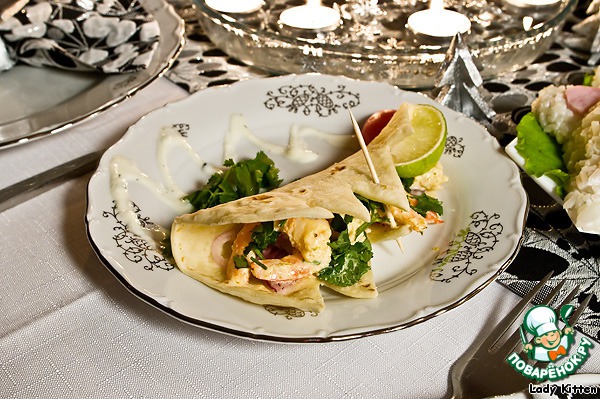 Рецепт «Креветки под соусом карри в тортильях-елочках»: