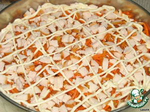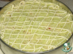 В форму диаметром 24 см укладываем послойно: картофель, тертый на терке, и майонезная сеточка. Чуть посолить.