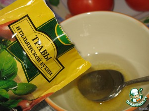 Смешиваем масло, уксус, мёд. Добавляем итальянские травы и давленый чесночок.