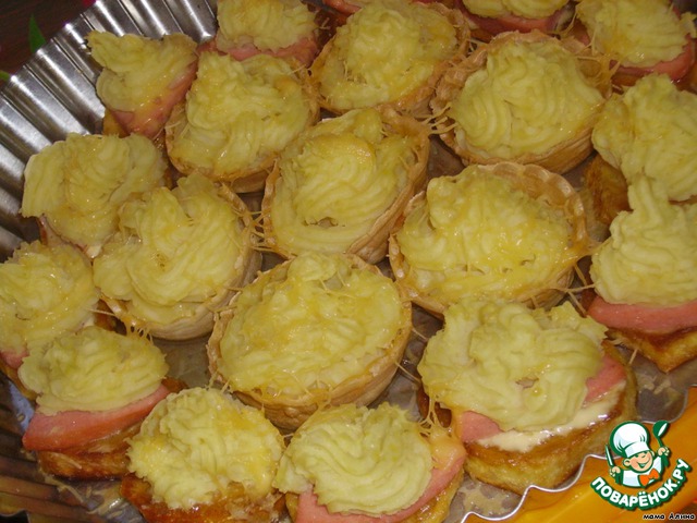 Беремся за вторые пирожные. Также смажем жареный картофель майонезом с чесноком. Сверху положим по кусочку вареной колбасы.