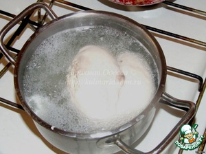 Ставим вариться куриное филе на бульон. Воду можно подсолить. Периодически снимаем пену. -