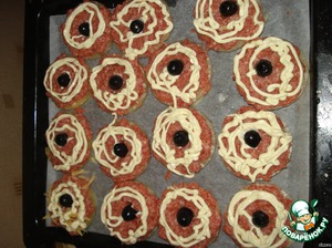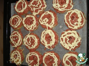В пакете с майонезом делаем небольшой надрез и выдавливаем кругами на кольца.