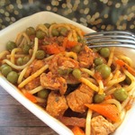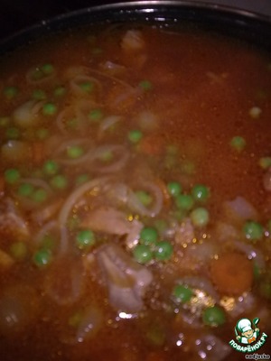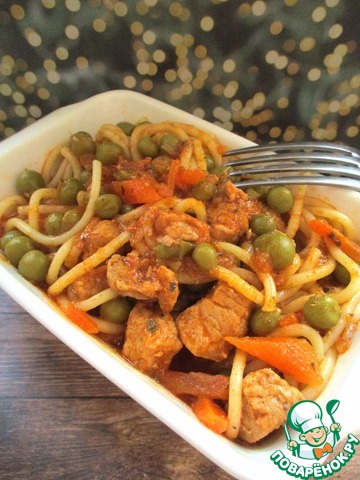 Немного отступила от рецепта. Горошек был консервированный, добавила его в мясо в конце тушения и туда же переместила макароны и всё вместе томила ещё минут пять.