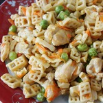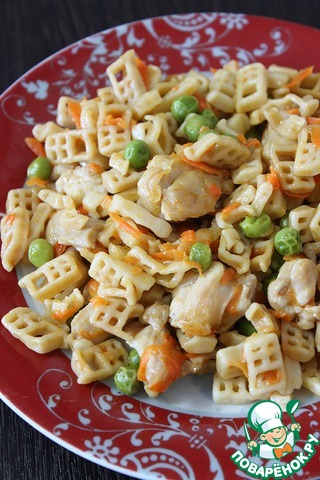 Очень вкусно получилось, макароны у меня правда не ракушки) И немного изменила технологию приготовления: Мясо с окорочка, обжарила на сковороде сначала лук с морковью, потом добавила курицу. К варящимся макаронам добавила горошек, потом воду слила в чашку. На сковороду добавила пару ложек кетчупа и макароны с горошком. Немного воды подлила, в которой они варились и протушила все еще немного вместе. Однозначно буду повторять.