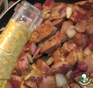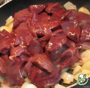 добавляем крупные кусочки печенки, даем немного поджариться (должна появиться только небольшая коричневинка)