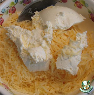 смешиваем тертый "Российский" сыр, сливочный(творожный) Almette, измельченный чеснок -