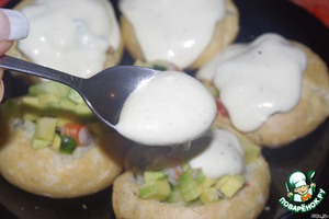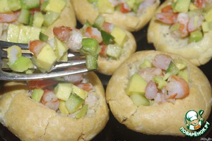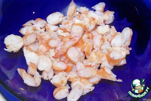 Выпекаем профитроли в разогретой до 180 градусов духовке, минут 20-25 (зависит от духовки). Тем временем, готовим начинку и крем. Для начинки, креветки размораживаем (если варёно-мороженые) или отвариваем, если свежие или просто замороженные. Очищаем, нарезаем небольшими кусочками (обязательно удаляя кишечную вену).