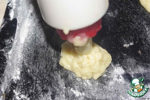 На противень, посыпанный мукой, отсаживаем профитроли. Можно просто ложкой, а можно при помощи кулинарного шприца или мешка.