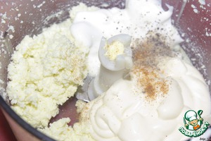 Для крема, отвариваем яйцо, помещаем его в блендер, добавляем сметану, немного соли и чёрный молотый перец. Взбиваем всё в блендере, до однородного состояния.