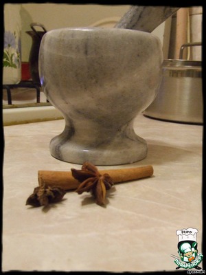 Для начала перетрем корицу и бадьян в ступке. Кто не любит пряный привкус аниса, обходится без него или использует имбирь.