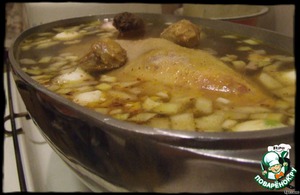Отвариваем утку до готовности. Я варил ее 1 час. Прибавил моркови, немного сельдерея, луковицу, на скорую руку соорудил маленький букет из листьев петрушки,сельдерея и листиков лавра. Утка была жирная и в итоге бульон получился отменный.