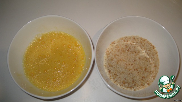 Взбиваем яйца и готовим панировку. У меня собственноручно сделанные из подсушенного в духовке батона и размолотого в комбайне (не ыбрасывать же добро)))