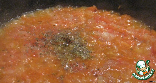 Итак, приступим. Помидоры опускаем на несколько минут в кипяток. Тем временем мелко режем лучок и обжариваем на оливковом масле до золотистого цвета. Помидоры очищаем от кожуры, она тепеь легко снимется и измельчаем либо вручную, либо в комбайне, на терке - как кто может вывернуться в этом пункте))) И добавляем их к лучку, солим, перчим, кладем наши ароматные травки и оставляем тушится мин 10.