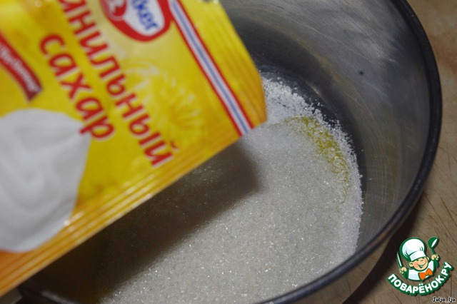 • Яйцо делим на белок и желток. В желток добавляем сахар и щепотку ванильного сахара.
