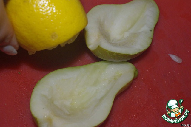 • Грушу разрезаем пополам, вырезаем серединку (немного мякоти тоже захватываем, чтобы побольше массы поместилось). Поливаем грушу лимонным соком, чтобы не потемнела.
