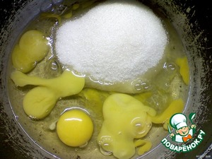 добавить растопленное сливочное масло, сметану, ванилин, разрыхлитель и просеянную муку. Хорошенько взбить эту массу две минуты миксером.