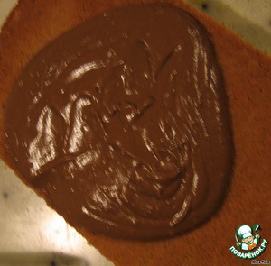 затем шоколадный корж, хорошо пропитываем соком и смазываем шоколадным кремом
