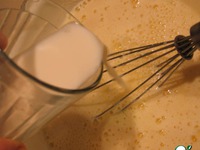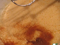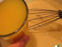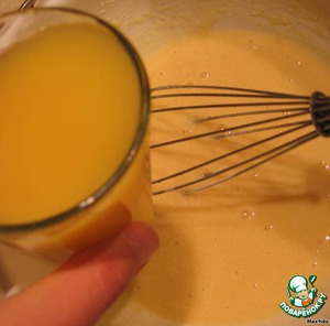 постепенно вливаем 2 стакана апельсинового сока, хорошенько мешаем венчиком, чтобы не было комочков