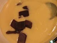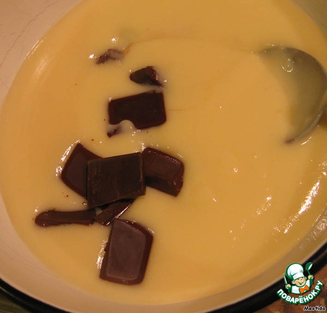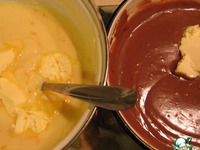 в другую часть (пока крем горячий!) - 50грамм темного шоколада, быстро перемешиваем, он хорошо растворяется и придает крему красивый шоколадный цвет