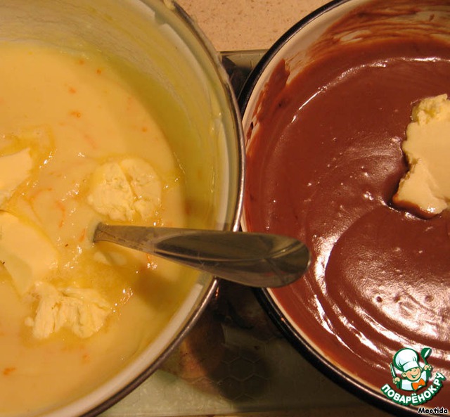 готовый крем делим пополам, в одну часть добавляем тертую на мелкой терке цедру одного апельсина