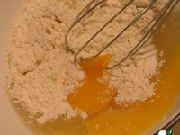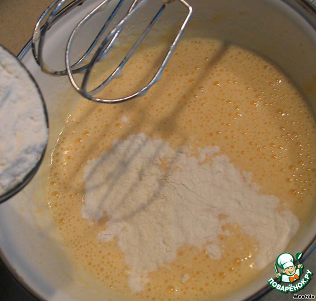 смешиваем 2 яйца, 2/3 стакана сахара, 2/3 стакана муки, немного ванилинчика, все это слегка взбиваем венчиком, чтобы получилась однородная масса -