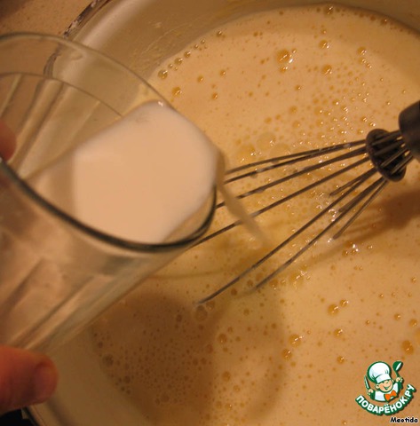 теперь выливаем 2 стакана молока и ставим крем "на водяную баню", готовим, постоянно помешивая, до загустения (если, вдруг у Вас получатся комочки, не огорчайтесь, просто взбейте готовый крем миксером или протрите через сито, мне это не потребовалось, крем получился замечательный шелковистый и очень нежный)