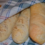 Лирическое отступление: Не волнуйтесь, это не много. Допеките до конца один, а остальные заморозьте. Как это делается? Легко! Вместо 10 минут печем хлеб 6-7, полностью остужаем, заворачиваем в пергамент, герметично упаковываем в полиэтиленовый пакет и закидываем в морозилку. Перед подачей кладем замороженный багет (только пакет снимите!) в духовку, включаем на 200 градусов и через 10-15 минут получаем горячий хлеб.