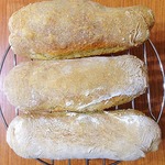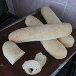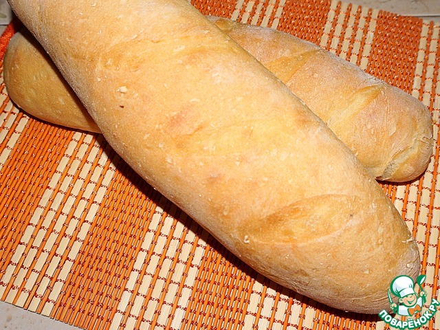 Итак, все расстоялось и поднялось. Ура!!! Посыпаем доску мукой, укладываем на нее багеты и острым ножом или лезвием бритвы делаем 5-6 диагональных надрезов. Режем быстро, чтоб тесто за ножом не «тянулось». Разогретую духовку быстро обрызгиваем водой из пульверизатора, быстро стряхиваем с доски на противень наши багеты, быстро закрываем духовку. И НЕ ОТКРЫВАЕМ ЕЕ МИНУТ 5!!! Иначе корочка не сделается такой восхитительно хрустящей, и труды наши пойдут прахом. 10 минут ждем. Если духовка со стеклом, наблюдаем. Если нет, через 10 минут заглядываем: Ну как, цвет корочки устраивает или сделаем поподжаристее? Еще 2 минутки! И вынимаем...