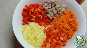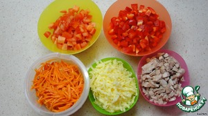 Помидор, перец, куриную грудку нарезать кубиками. Сыр натереть на крупной тёрке.