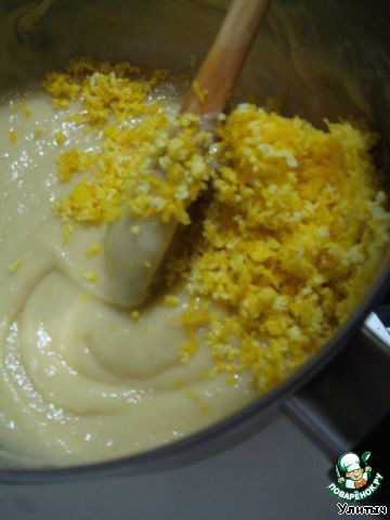 И в конце тертую цедру одного апельсина. Вымешиваем. Тесто получается чуть жиже чем на эклеры.