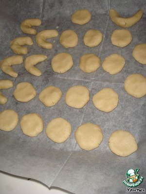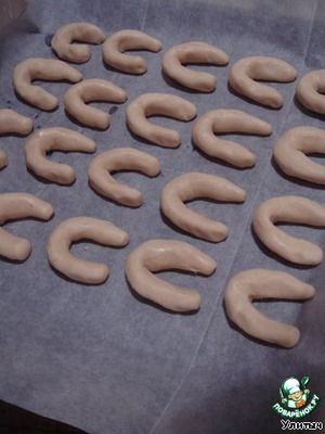 Раскатываем в руках колбаски, толщиной в сантиметр и выкладываем на противень с пергаментной бумагой в виде полумесяца.