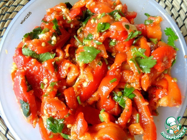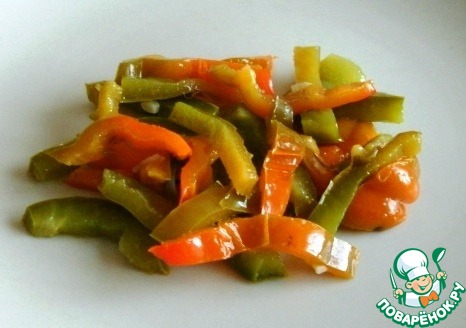 Этот салат прекрасно подойдет для праздничного стола! Потому что, этот маринованный перец - очень вкусный! Хотя сейчас в это время немного дорого, но эта замечательная закуска того стоит, и самое главное – витамин «С» не распадается при тушении и мариновании перца, тем он и хорош! Попробуйте, очень рекомендую! При мариновании перца не забудьте, пожалуйста, бальзамический уксус, который придаст блюду фантастический вкус!