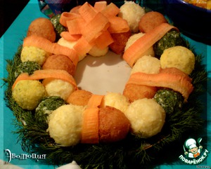 Когда-то мельком увидела в интернете закуску в виде рождественского венка и несложный рецепт. И вот ночью он приснился. Дескать, что же ты – поглядела и все? Воспроизвела примерно… На конкурс «Gorenje: новогодняя композиция».