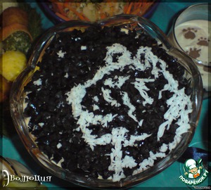Вообще, маслины мне здесь понадобились лишь для оформления. Я их вкуса не понимаю и поэтому сдвигала этот слой в сторону. Но мама лопала и облизывала ложку, заявляя, что они отлично вписались в рецепт! Так что на счет маслин – смотрите по своему вкусу;-)