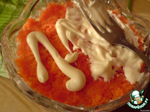 На рис – мелко натертую вареную морковь. Смазываем майонезом.