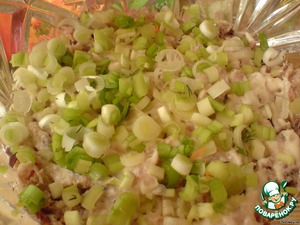 Лук режем мелко-мелко. У меня оставались белые головки зеленого лука. Мне они нравятся намного больше. И в салате они звучат не так агрессивно.