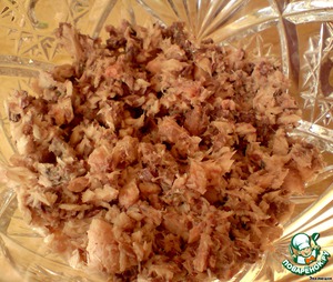Рыбку вынимаем из банки, убираем хребты, плавники. Разминаем вилочкой. Укладываем на дно салатника. Смазываем майонезом.